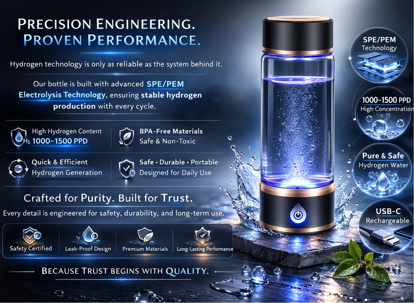 Generates hydrogen-rich water in just 3 minutes, designed to elevate your everyday hydration routine.
